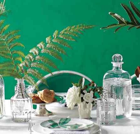 Green can really bring a home to life. Just take this dining room setting: The wall is painted a dramatic forest shade of green. The table is set with leaf-printed dishware alongside an array of glass decanters and tumblers, some of which are left empty and others that showcase minimal arrangements of white carnations, leafy …